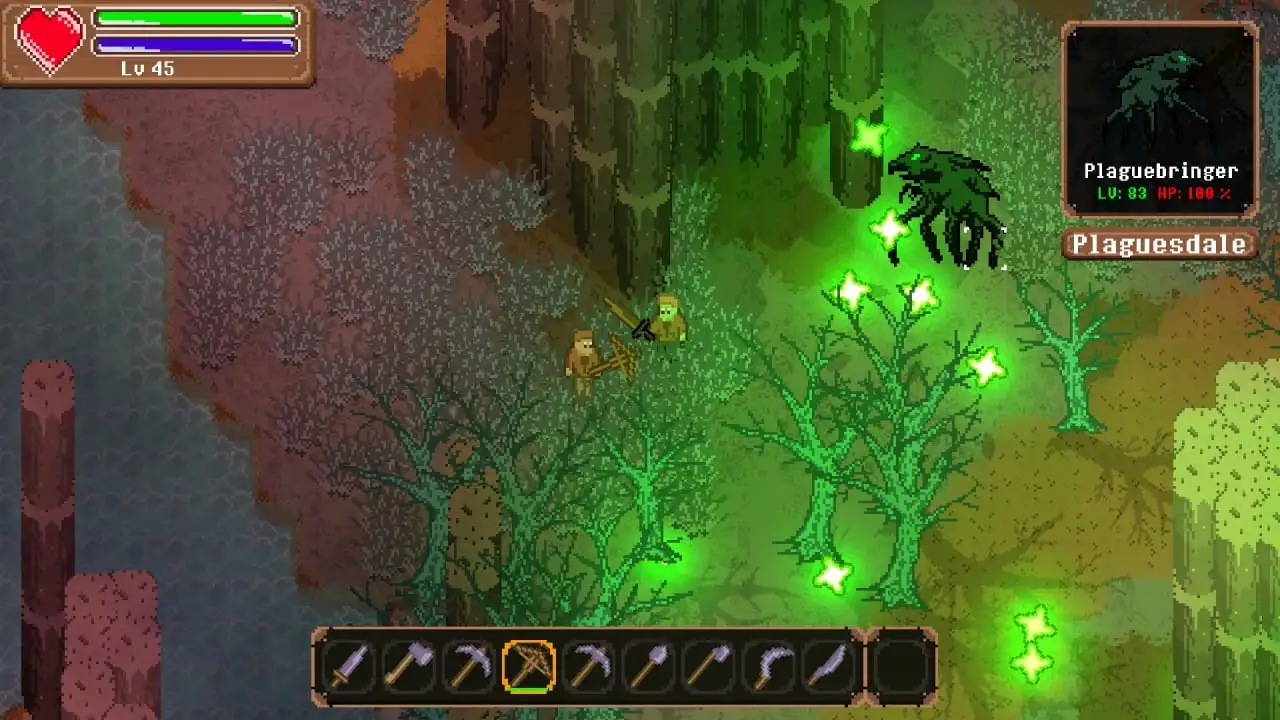 АнглийскийОписание игрыHallowlands объединяет элементы приключенческой игры, ролевого экшена, песочницы и симулятора выживания в открытом мире. Графика выполнена в стиле пиксель-арт с использованием двухмерных изображений в низком разрешении. Камера расположена сверху под углом. В игре присутствует кровь. Игрок может рубить деревья, добывать ресурсы и использовать их для создания оружия и предметов. Некоторые инструменты имеют ограниченный срок службы. Часть снаряжения можно приобрести у торговцев или найти в различных локациях. В игре есть система инвентаря и кукла персонажа. Помимо ближнего боя доступен дальний. Сражения происходят в реальном времени. Игроки могут изучать магию и использовать её в боях. Также есть возможность строительства и ведения сельского хозяйства. Опыт позволяет повышать уровень героя.